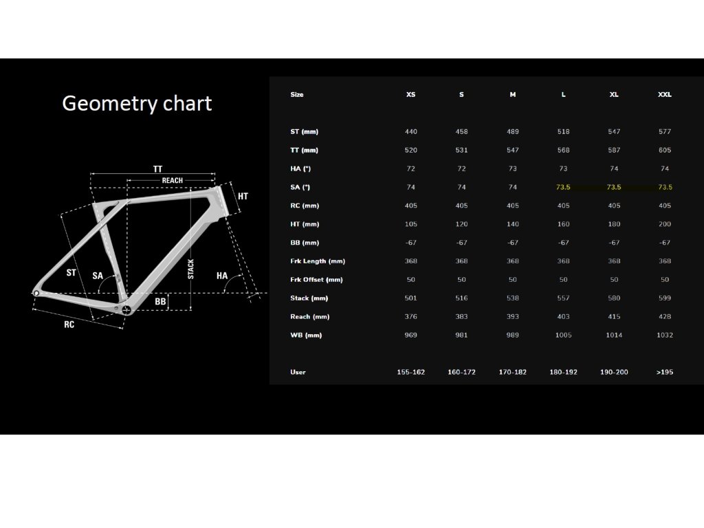 Nejvýraznějšími změnami v geometrii je o 0,5° kolmější sedlovka (74°). Kratší hlavová trubka s nižším odporem vzduchu a delší Reach pro více sportovní posed zaměřený na výkon. Do nabídky také přibyla velikost XXL pro jezdce nad 195 cm.
