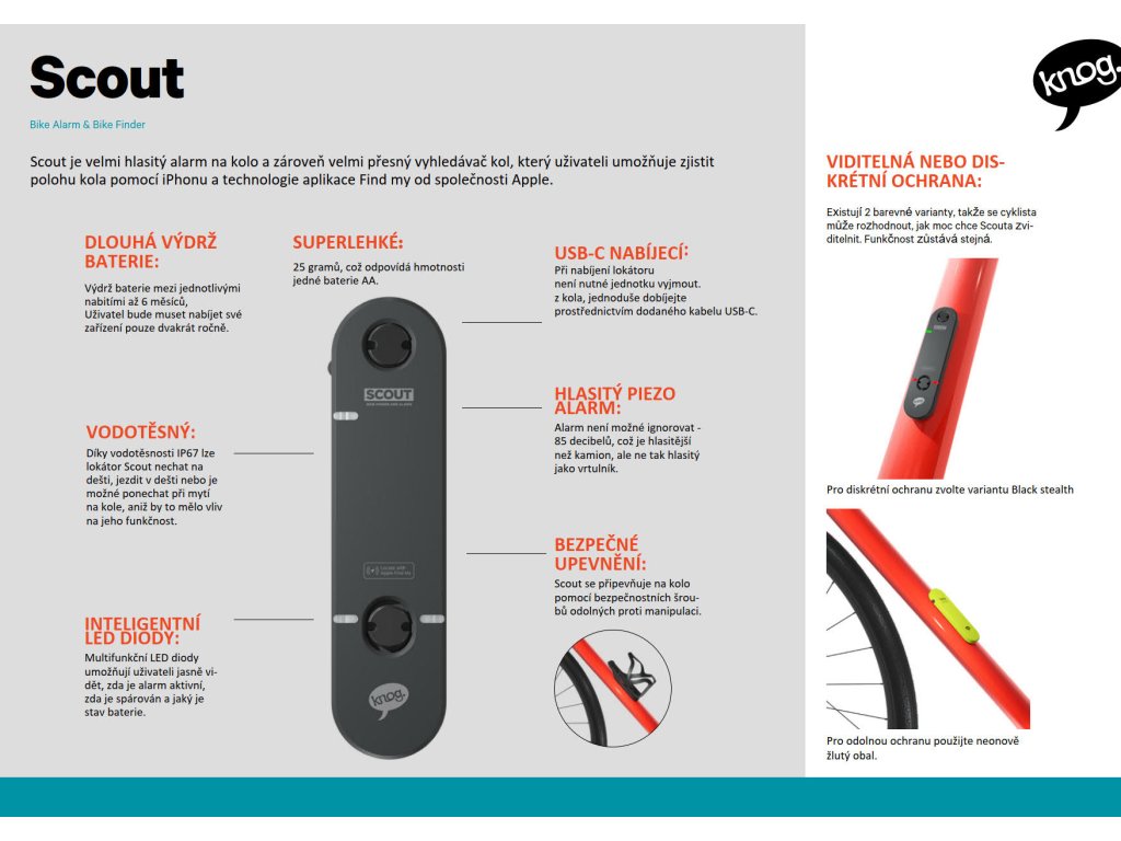 KNOG Scout je lehký a nízkoprofilový lokátor a alarm pro jízdní kola navržený tak, aby se bez problémů integroval do sítě produktů FindMy od Apple, a umožňuje sledovat, kde se kolo nachází, i když není zrovna v pohybu. Připevnění je diskrétní a bezpečné pod jakýkoli košík na láhev pomocí dodávaných bezpečnostních šroubů. Zařízení se dobíjí přes USB-C a při běžném používání vydrží v provozu přibližně 6 měsíců. Cyklisté mohou aktivovat/deaktivovat alarm citlivý na pohyb, lokalizovat zařízení a kontrolovat výdrž baterie prostřednictvím aplikace Knog.