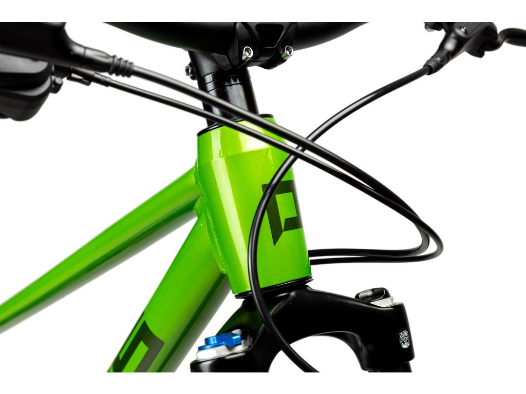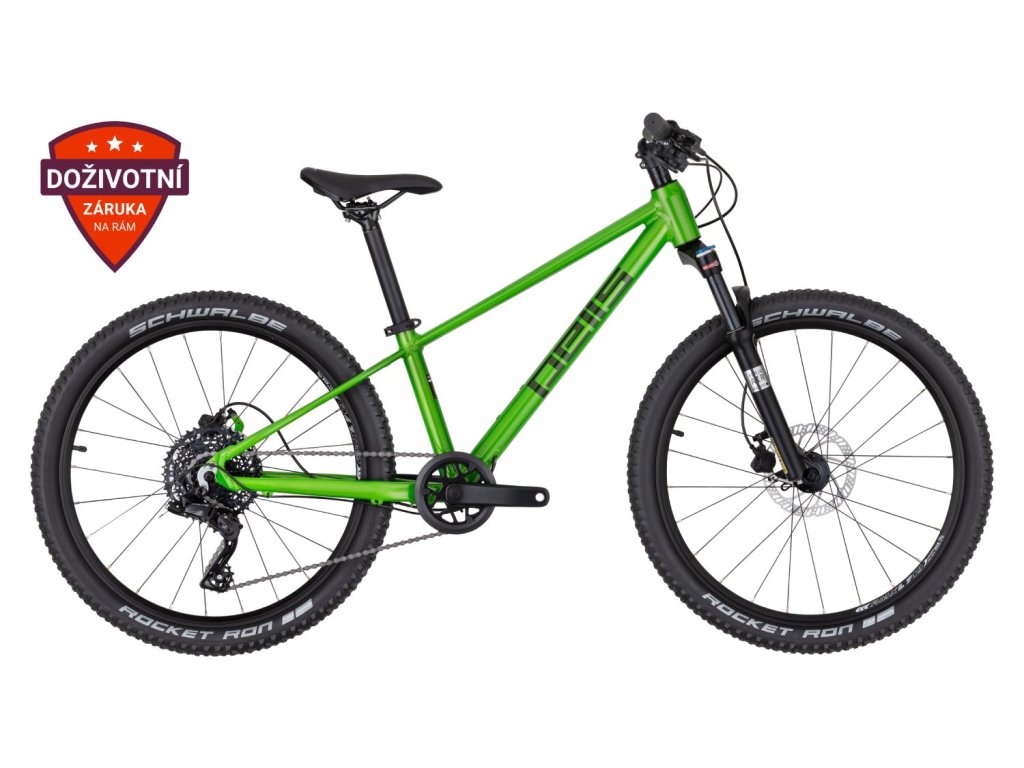 Rocket Air je dětské kolo s 24“ koly vybaveno vzduchovou vidlicí SUNTOUR XCR Air se zdvihem 80 mm a zajímavým řazením MICROSHIFT Acolyte 1x8s, které je na přehazovačce vybaveno brzdou, což zamezuje bouchání a padaní řetězu při jízdě náročnějším terénem. Na pozici brzd najdete hydraulické TEKTRO v juniorském provedení. Osazené pláště jsou SCHWALBE Rocket Ron o šíři 2,1“ s kevlarovou skládací patkou pro dosažení nízké hmotnosti.