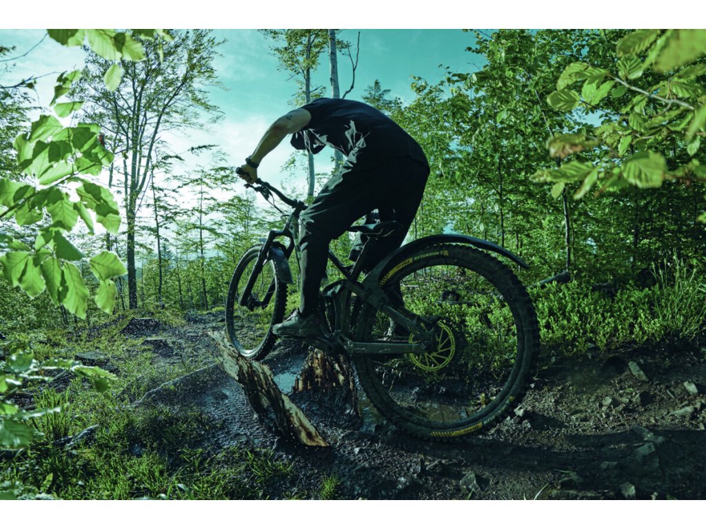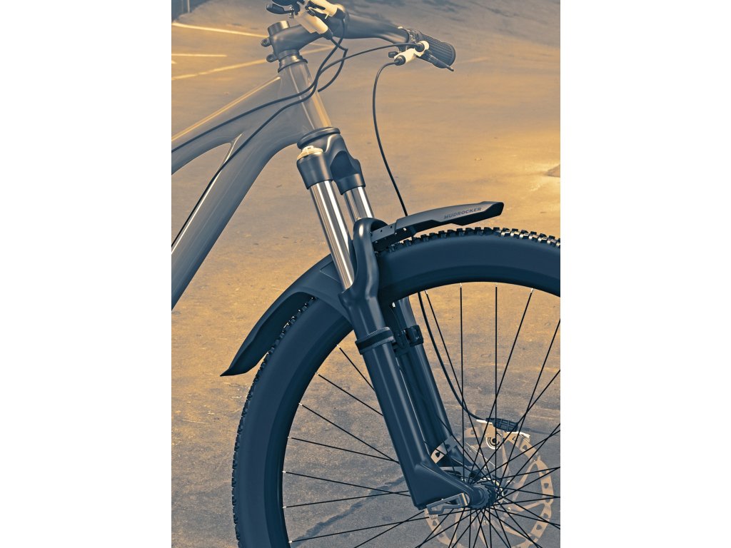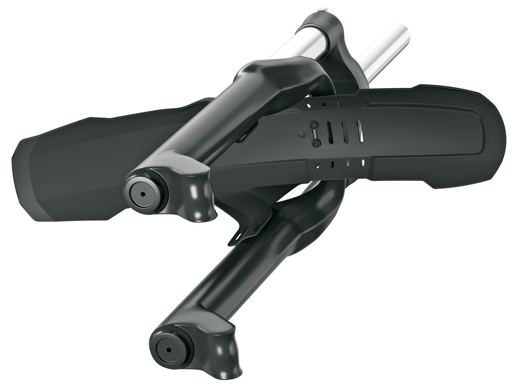 Jednoduchý designový blatník pro celoodpružená kola. Uchycuje se na můstek vidlice, zde se uchytí dodávaným adaptérem. Blatník může být připevně k můstku také páskami se suchým zipem či plastovými stahovacími pásky. Po stranách se připevní dodávanými suchými zipy k nohám vidlice. Blatník zároveň chrání nohy vidlice z vnitřní strany. Blatník se dá upravit nůžkami v případě potřeby.